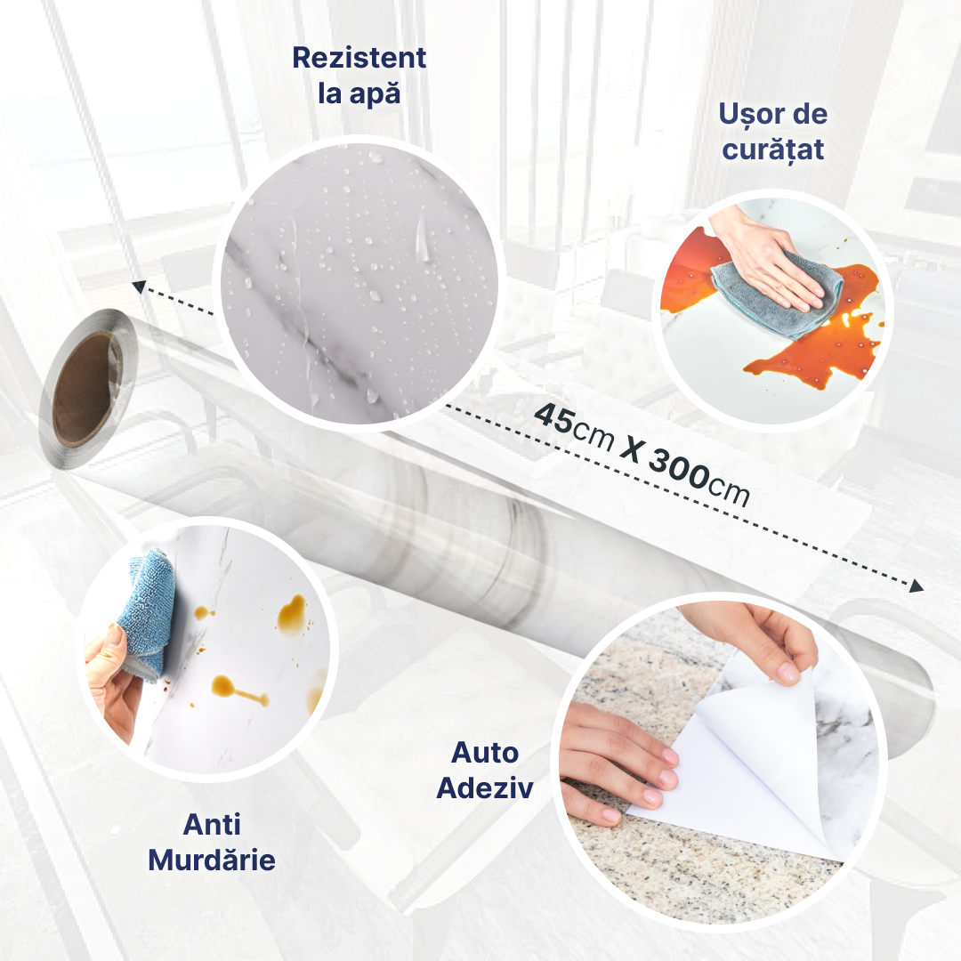 Se lipește perfect pe orice suprafață netedă, fără lipici sau scule, având o dimensiune generoasă de 45cm x 300cm, ideală pentru blaturi, mobilă sau pereți.