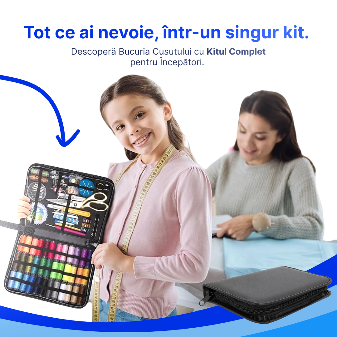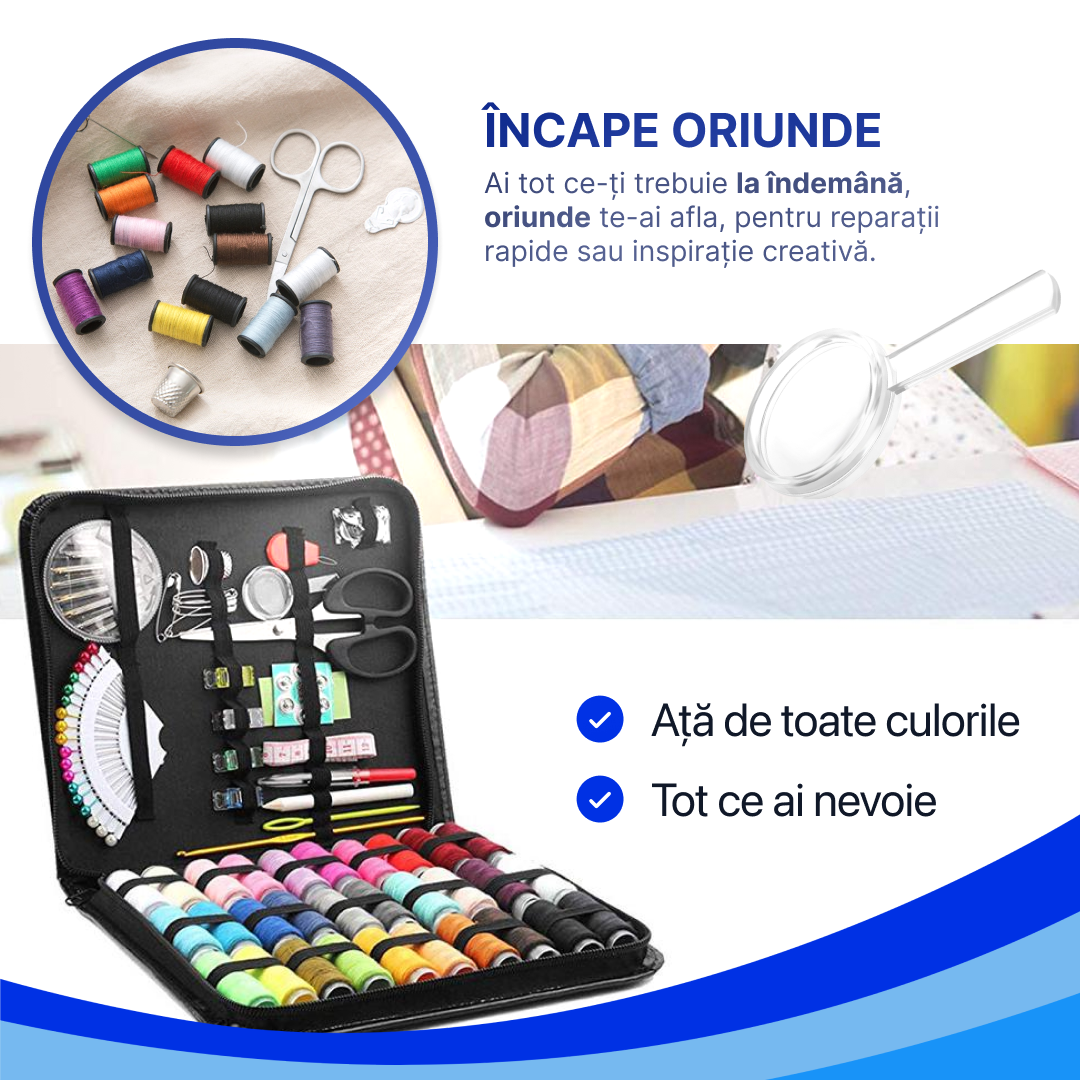 Tot ce-ți trebuie într-un singur kit: ace, ațe, desfăcător, degetar, metri, mini-foarfece & altele.